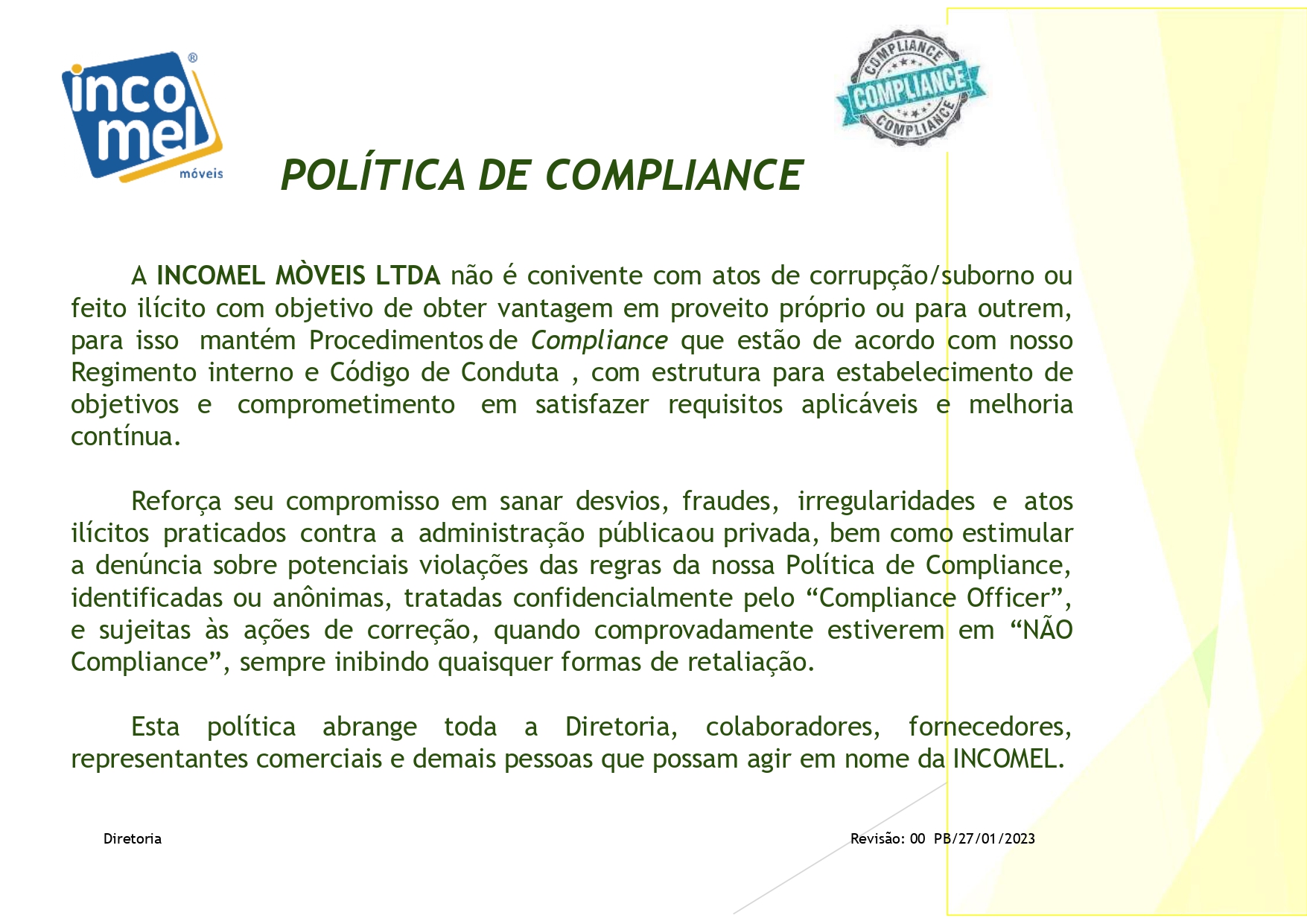 Obrigado por ter chegado até aqui, para fazer um registro no nosso canal de Compliance. Esse canal serve para você registrar ou denunciar qualquer atitude, procedimento ou situação, que não esteja de acordo com nossa Política de Compliance ou com a legislação vigente. Para prosseguir, clique no botão abaixo. Caso prefira, o registro pode ser feito pelo telefone +55 83 98821-3300.